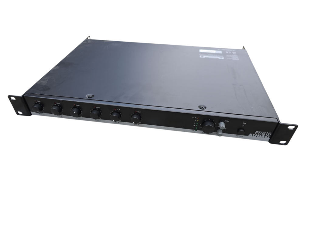 Deze PRE16 van Audac is een compacte mixer zonder overbodige poespas. Deze mixer, die kan worden ingebouwd in een 19″ rack(case), heeft twee microfoonkanalen en vier stereo kanalen.